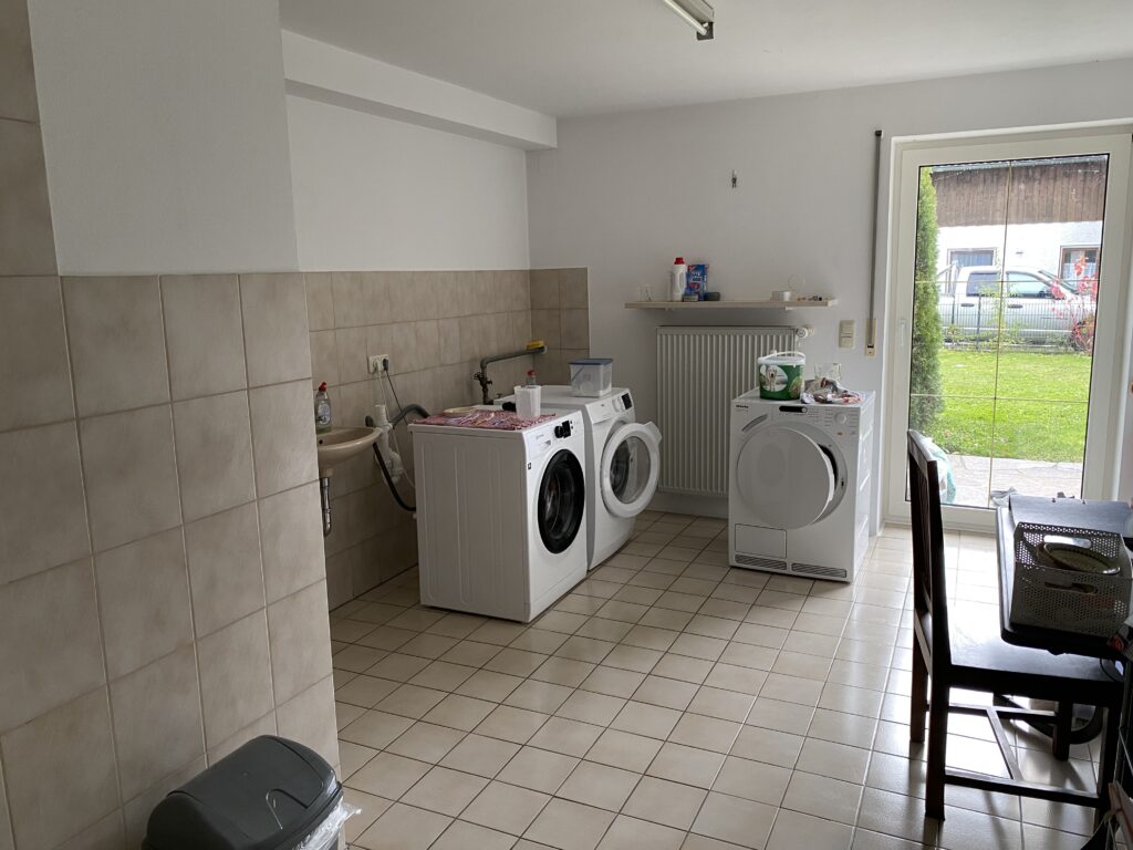 große Waschküche mit WC und Dusche sowie direktem Zugang auf die Terrasse/ in den Garten
